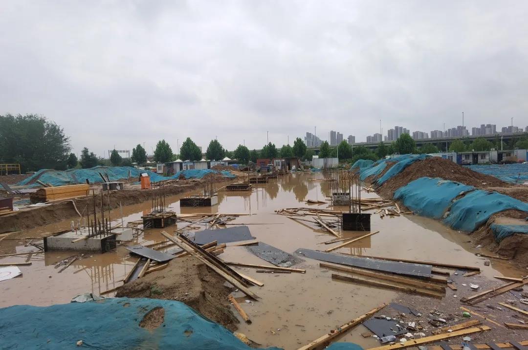 结构件示范工厂工地在这次洪水灾害中,现场站房基坑、设备基础基坑泡水,施工临时用电设备泡水、园区道路大量淤泥、路侧大树倾倒,在这种极端恶劣天气之下,工地指挥部及所有施工人员没有退缩,积极开展自救工作。